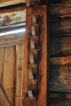 Using what is readily available, saplings are cut and pegged into the barn wall to hold harness. Notice the inside of the walls have a strip of wood to help hold the chinking in between the logs.