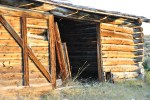 With its wide, sliding door, this building was probably for livestock or horse drawn equipment storage. The main walls are log with the sliding door on the left made of sawn boards.